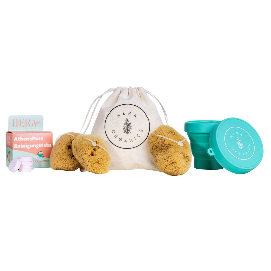 • Die einmalige Anschaffung dieses Sets befreit Dich von der ständigen Notwendigkeit, Einwegprodukte zu kaufen und zu entsorgen. Mit dem langlebigen Case, den 6 Reinigungstabs und den 3 HERA Menstruationsschwämmen mit wieder verwendbarem Rückholfaden hast du alles, was du für einen sorgenfreien Menstruationszyklus benötigst.